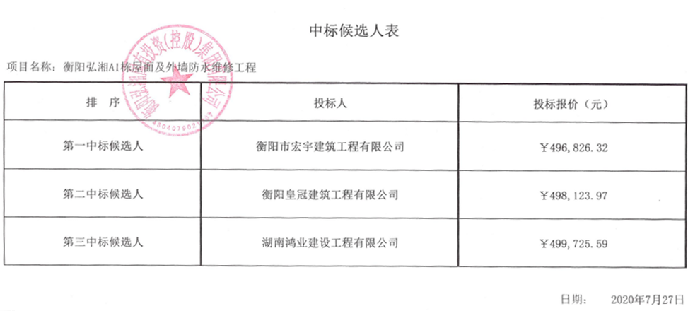 衡陽弘湘A1棟屋面及外墻防水維修工程中標(biāo)候選人公布