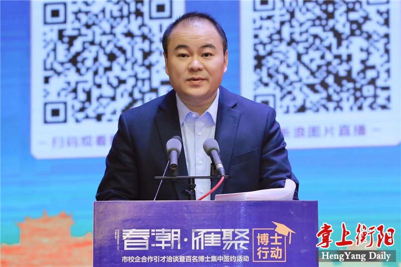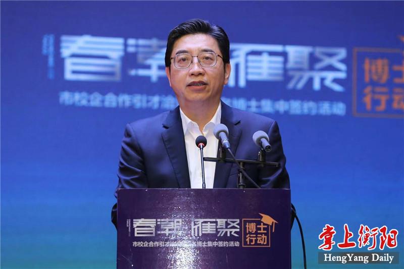 4月29日上午,“春潮·雁聚”博士行動(dòng)——市校企合作引才洽談暨百名博士集中簽約活動(dòng)在衡舉行,市委書(shū)記鄧群策在簽約儀式上向五湖四海的人才發(fā)出誠(chéng)摯邀請(qǐng),期望各位才俊用所學(xué)所得的智慧之光,照亮深入推進(jìn)“一體兩翼”建設(shè)的騰飛之城,在衡陽(yáng)這片高質(zhì)量發(fā)展的熱土上成就輝煌事業(yè)、書(shū)寫(xiě)精彩人生。市委副書(shū)記、市長(zhǎng)朱健主持簽約儀式。