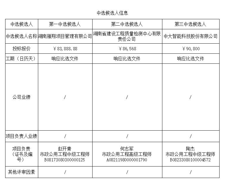 植物園片區(qū)雁云路(幸福河街-紅峰路段)項(xiàng)目檢測(cè)單位咨詢服務(wù)比選于2025年08月21日15時(shí)00分在衡陽國投4棟3樓評(píng)標(biāo)室進(jìn)行了比選開標(biāo)、評(píng)標(biāo)活動(dòng),評(píng)標(biāo)委員會(huì)按照比選文件及相關(guān)法律法規(guī)規(guī)定進(jìn)行評(píng)審,推薦以下三名中選候選人(排序),現(xiàn)將相關(guān)信息予以公示。