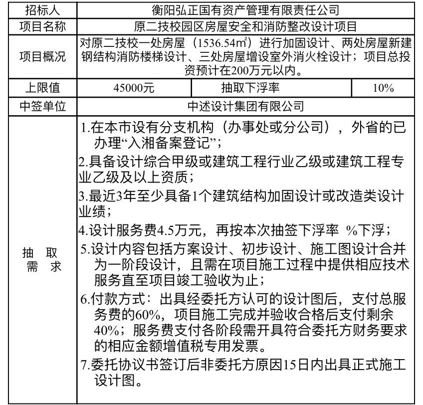 原二技校園區(qū)房屋安全和消防整改設(shè)計(jì)項(xiàng)目于2025年10月17日在衡陽(yáng)國(guó)投4棟3樓評(píng)標(biāo)室進(jìn)行了隨機(jī)抽取,現(xiàn)將相關(guān)信息予以公示。
